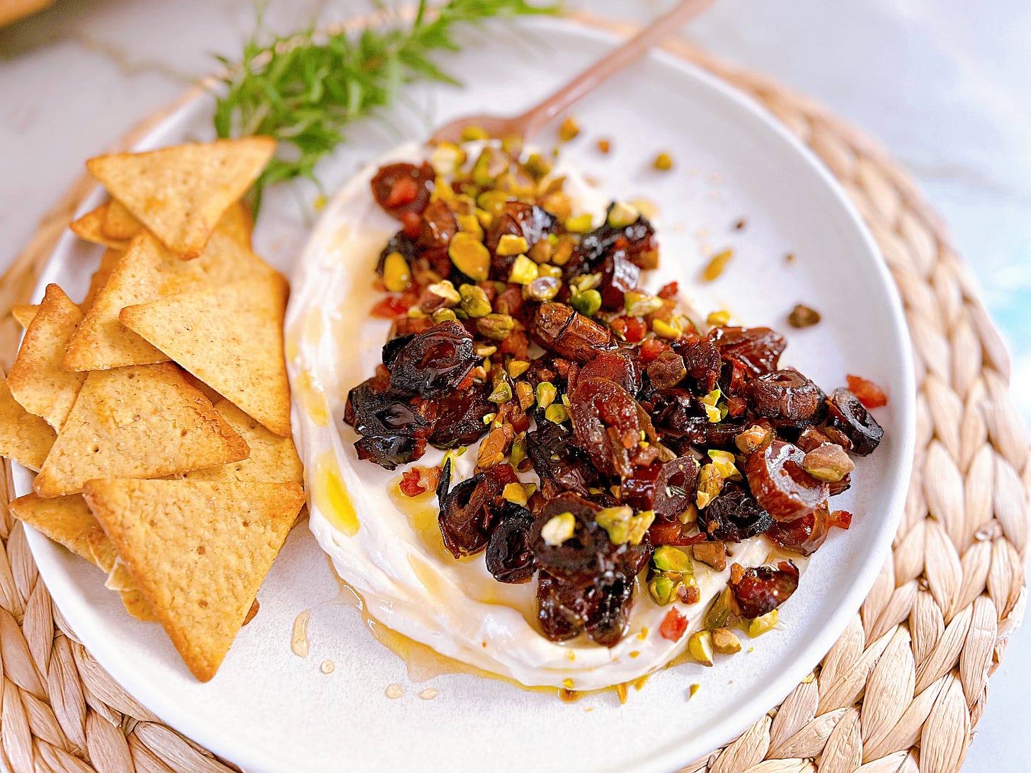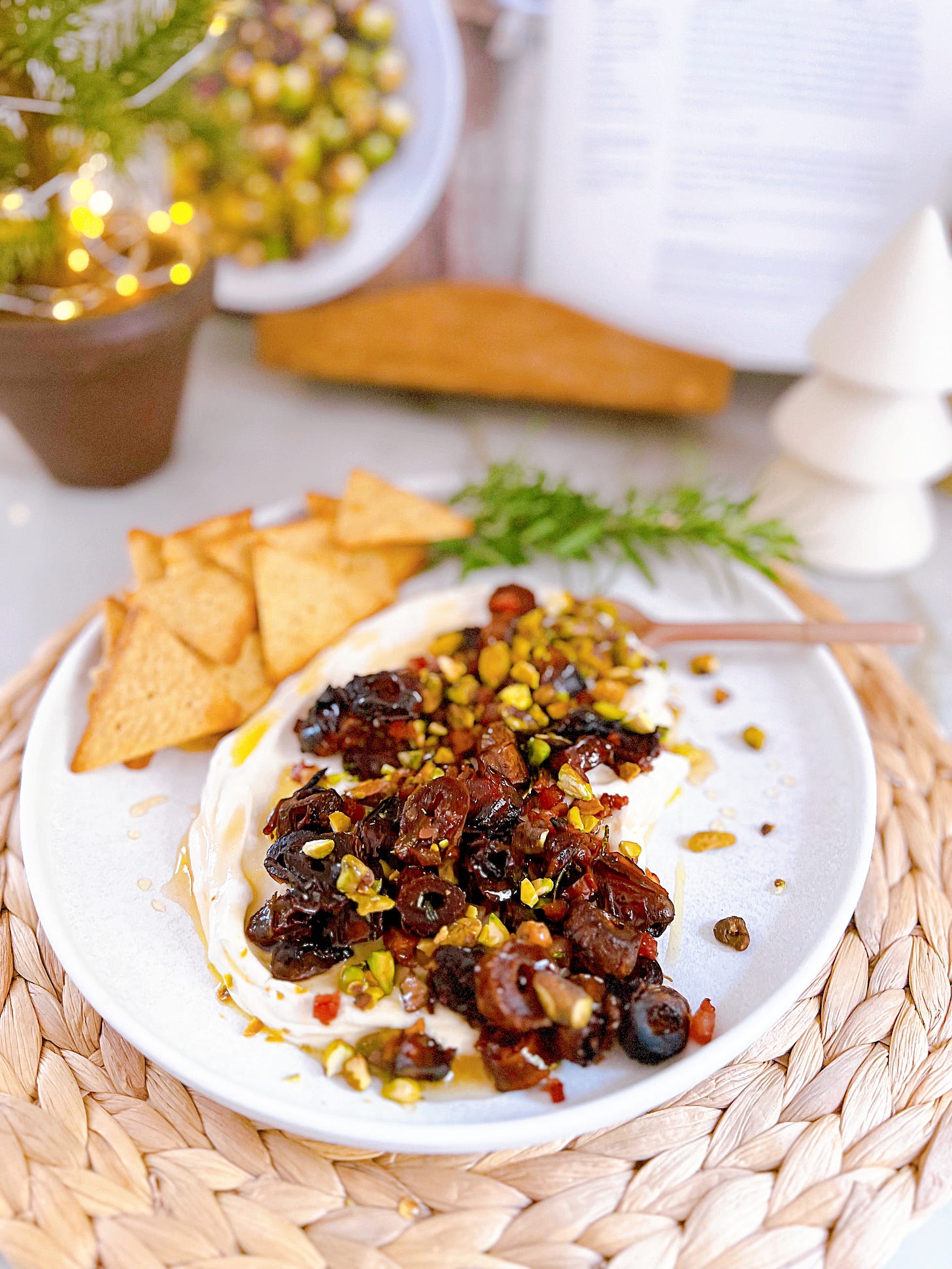 This year I decided to simplify the whole idea and turn it into a festive dip that tastes luxurious but comes together in minutes. The base is dairy-free whipped ricotta. I use Kite Hill and blend it until it becomes soft and cloud like with a little olive oil. The warm topping is a mix of pancetta, rosemary, and chopped dates that turn crisp and sticky in the air fryer. Once it is spooned over the ricotta, I finish it with honey, a little olive oil, a sprinkle of Maldon, and a handful of chopped pistachios. The pistachios add just the right amount of crunch and color and make the whole platter feel even more fit for the holidays.