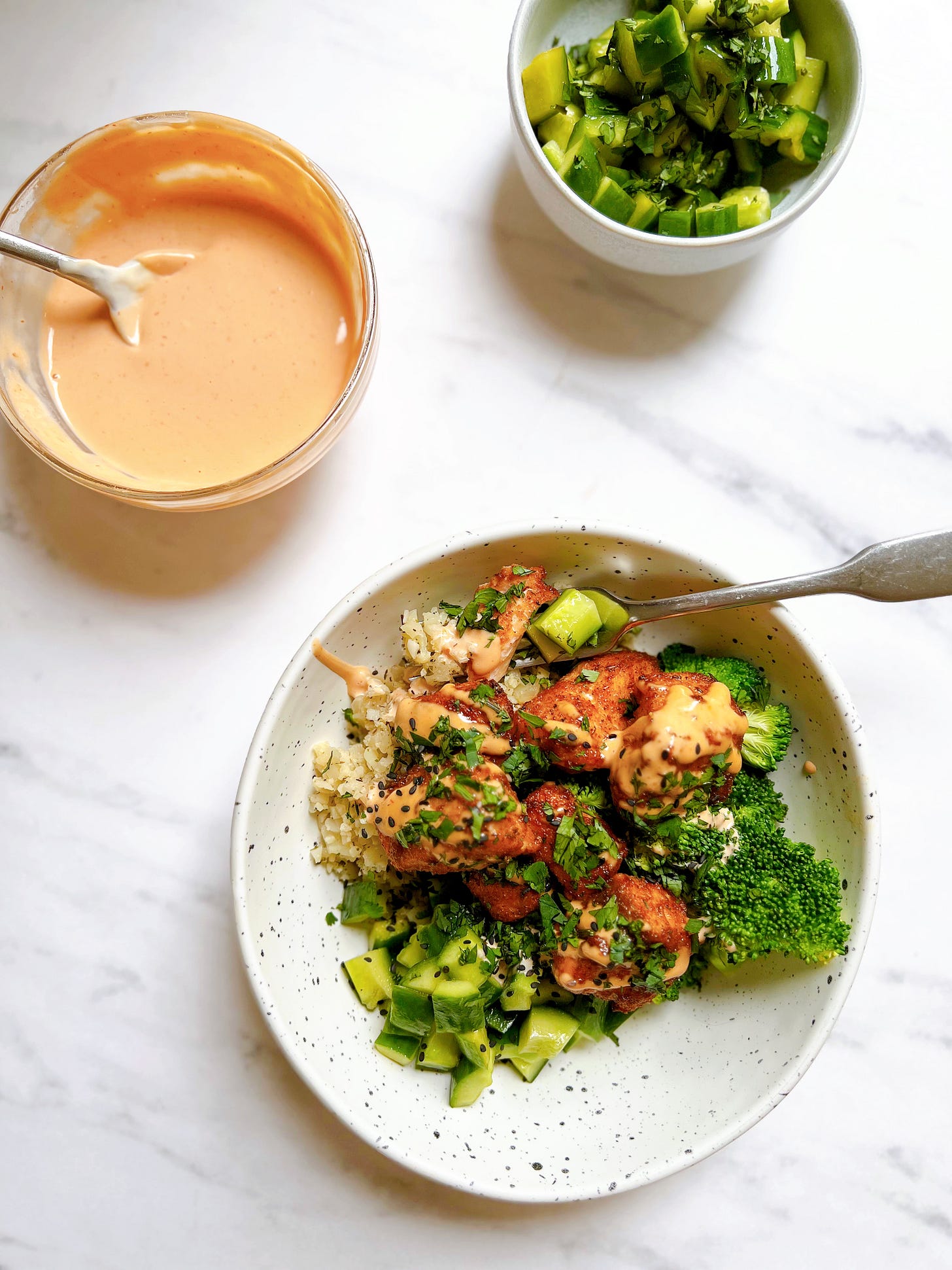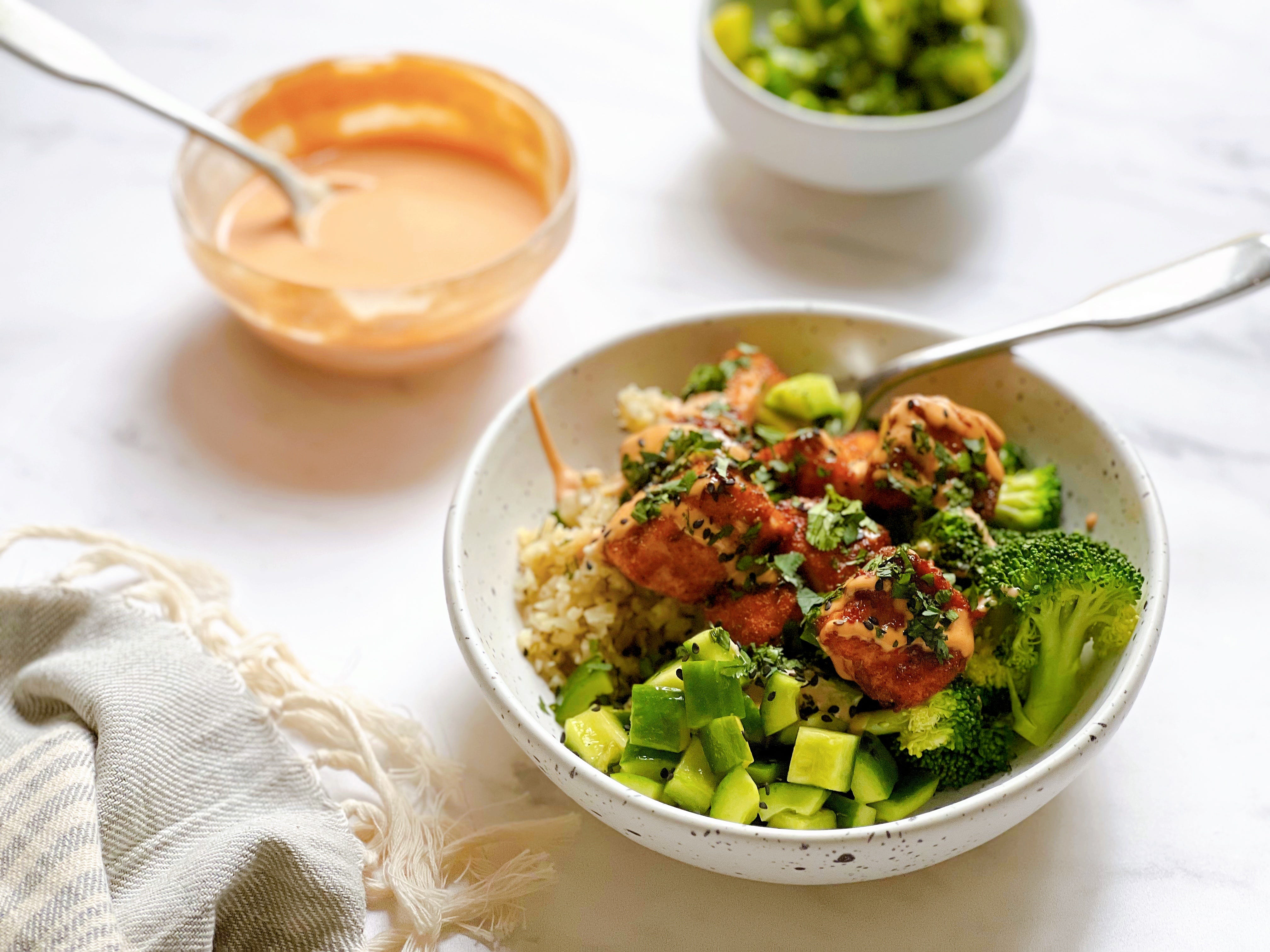 Think tangy-sweet cucumber salad, warm cauliflower rice, crispy seasoned salmon, tender broccoli, and a generous drizzle of sriracha mayo to bring it all together. It has all the flavors of your favorite sushi roll, just layered into a bowl and built for real life.